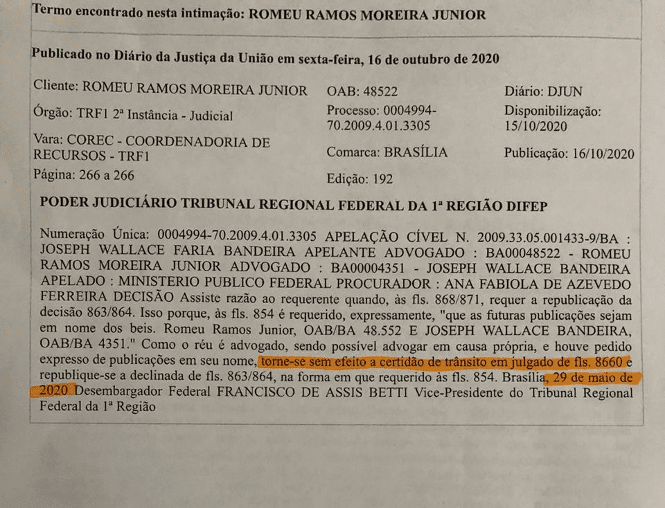A Justiça Federal tornou sem efeito a situação de transitado em julgado do processo do ex-prefeito de Juazeiro (BA), Joseph Bandeira, e o torna elegível, derrubando os argumentos de seus adversários políticos. A decisão foi publicada no Diário Oficial da Justiça da União, na última sexta-feira (16).