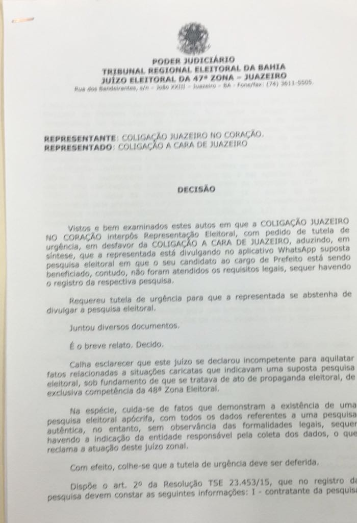 A nota ainda diz que “a representação eleitoral, feita pela coligação ‘Juazeiro no Coração’, apontou que a pesquisa teve o intuito de manipular a opinião pública, induzindo que algum determinado candidato esteja mais representativo. Diante da forma que a possível pesquisa foi realizada, sem nenhum registro, ultrapassando os limites legais, desrespeitando o Art. 33, caput da Lei 9504/97″, finaliza. A sentença pode ser conferida aqui. Com a palavra, a coligação de Joseph Bandeira.