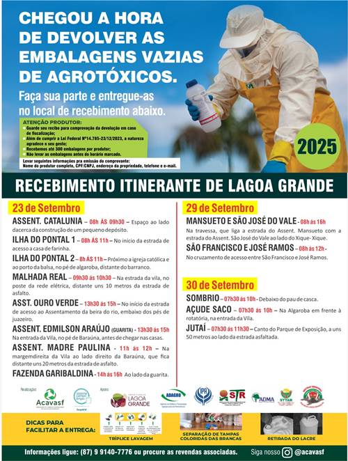Em Lagoa Grande (PE), no Sertão do São Francisco, a Secretaria Municipal de Agricultura e Desenvolvimento do Interior (Seadi), em parceria com a Agência de Defesa do Meio Ambiente (ADMA), inicia nesta terça-feira (23) a campanha de devolução de embalagens vazias de agrotóxicos. A ação tem como objetivo promover o descarte ambientalmente correto desse material, garantindo a preservação do meio ambiente e a segurança das famílias que vivem no campo.