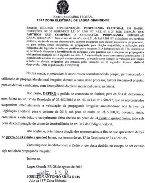 Uma ação impetrada pela coligação ‘Avante Lagoa Grande’, do candidato a prefeito Vilmar Cappellaro (PMDB), levou o juiz da 137ª zona eleitoral, Josilton Antônio Silva Reis, proferiu mais uma sentença condenatória contra a coligação ‘É daqui Pro Futuro’, do prefeito Dhoni Amorim (PSB), que tenta a reeleição. O magistrado entendeu que Dhoni violou regras quando teria divulgado “propaganda difamatória e irregular”.