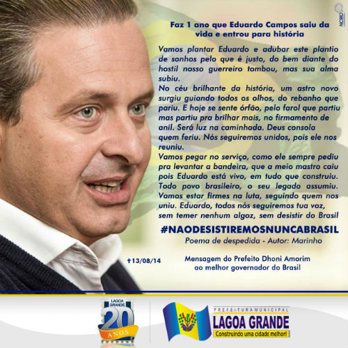 O município de Lagoa Grande (PE), no Sertão do São Francisco, é mais um a reforçar as homenagens póstumas desta semana ao ex-governador de Pernambuco Eduardo Campos, que faleceu tragicamente há um ano, num acidente aéreo em Santos (SP). A Câmara de Vereadores realizará nesta terça-feira (11), às 19h, uma sessão solene em memória do líder socialista.