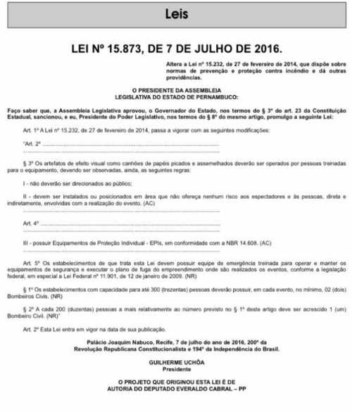 O presidente da Assembleia Legislativa de Pernambuco (Alepe), Guilherme Uchôa, aprovou este mês um projeto de autoria do deputado Everaldo Cabral (PP), alterando a Lei 15.232, de 27 de fevereiro de 2014, que dispõe sobre normas de prevenção e proteção contra incêndios no estado. Um dos pontos cruciais está em dois parágrafos do artigo 5º.