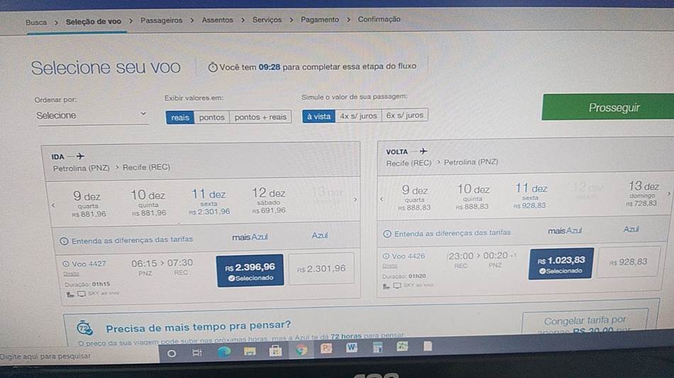 A única companhia que faz voo direto para o Recife é a Azul Linhas Aéreas. Ao acessar o site da empresa, ele solicitou a viagem de ida para o próximo dia 11/12, e teve de desembolsar R$ 2.396,96; a volta, no mesmo dia, ficou por R$ 1.023,83. Somando, dá nada menos que R$ 3.420,79.