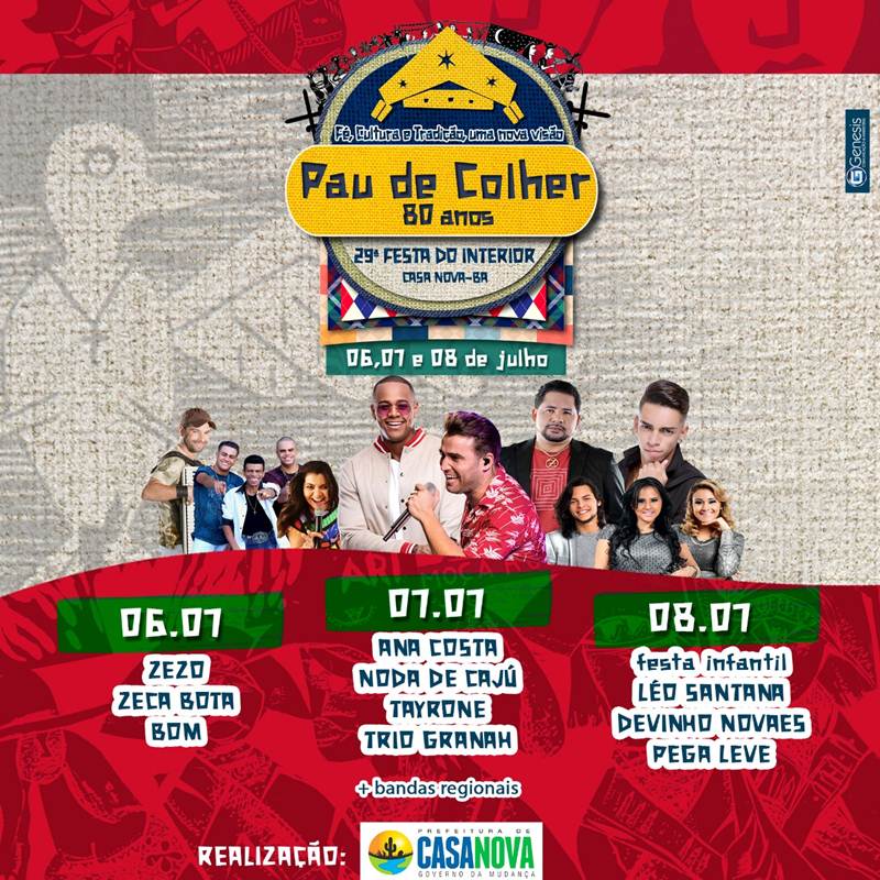 A Prefeitura de Casa Nova, no norte da Bahia, divulgou as atrações da 29ª Festa do Interior, que acontecerá de 6 a 8 de julho.
