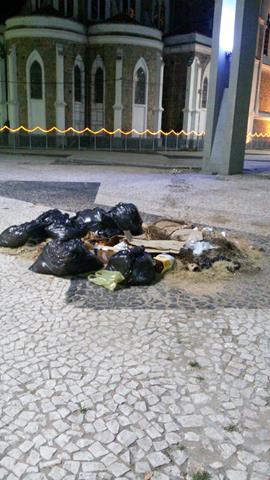 Pelo WhatsApp, o Blog recebeu a foto acima, mostrando o problema. Que, aliás, não se resume apenas a lixo. Na área da catedral (entre as praças Dom Malan e Maria Auxiliadora), é comum também ver usuários de drogas – especialmente crack – circulando pelo local, apesar do trabalho realizado pelo Conselho Tutelar, já que alguns são menores de idade. Uma tristeza.