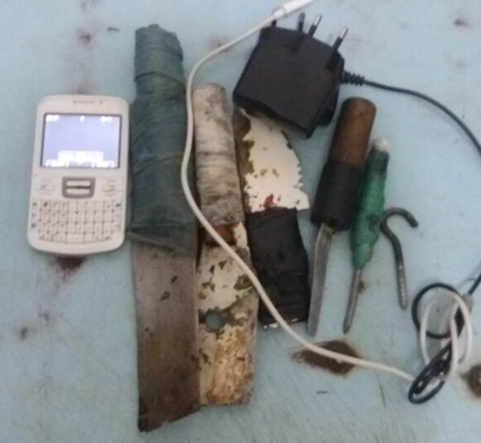Ainda na Cadeia de Santa Maria, na noite de ontem, foi realizada uma revista e encontrados vários materiais – entre eles um celular, carregadores e chuços (arma artesanais feitas com madeira e material pontiagudo).