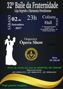 Em Petrolina, os maçons e seus familiares já vivem a expectativa para a realização da 32ª edição do Baile da Fraternidade, que acontecerá no próximo dia 2 de setembro, no Coliseu Hall, Avenida Monsenhor Ângelo Sampaio.