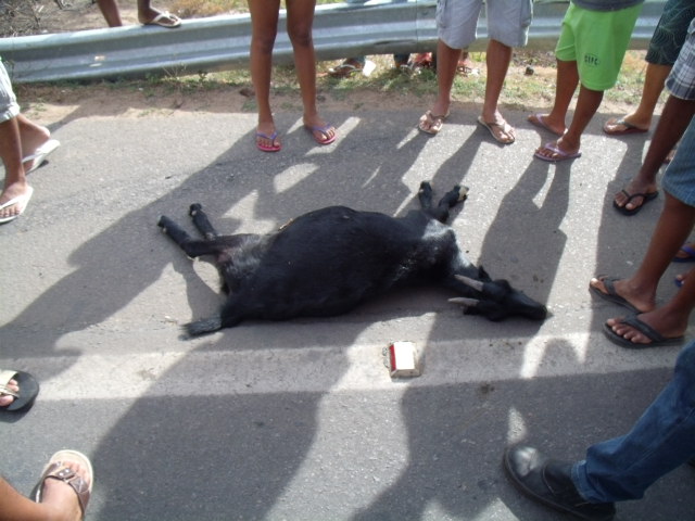 Um acidente de trânsito foi registrado agora há pouco na BR-428, nas proximidades do município de Lagoa Grande (PE). Segundo a polícia, o motorista perdeu o controle do veículo ao tentar desviar de um bode que cruzava a pista (foto).