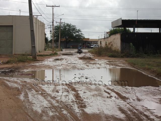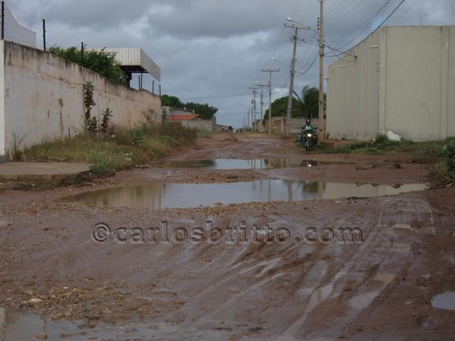 Independentemente se a foto é antiga ou recente (na verdade choveu à algumas semanas, é tanto que o cacheado ficou inundado), continua sem pavimentação. E se a foto for antiga, pior ainda, sinal que NADA foi feito em um grande espaço de tempo.