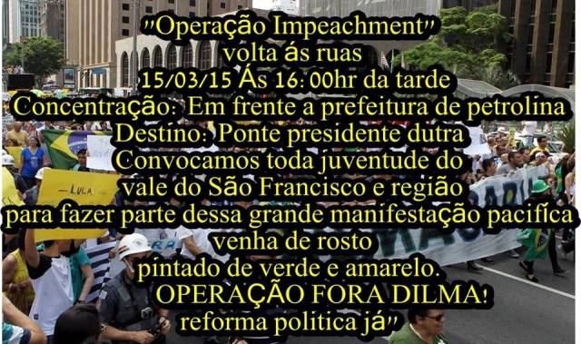 Pelas redes sociais, centenas de pessoas já confirmaram presença no evento que sai de Petrolina e segue até Juazeiro. Segundo representantes do Movimento intitulado ‘Operação impeachment’ a ideia é levar milhares de manifestantes às ruas para mostrar a insatisfação popular com o governo PT.
