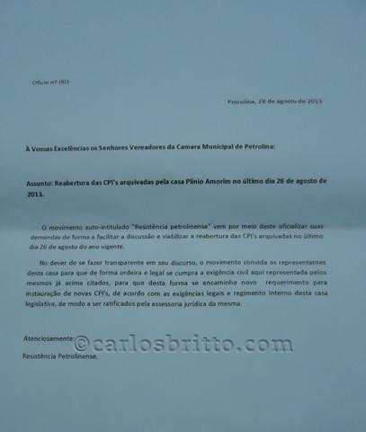 Câmara 2OfícioOs manifestantes que estão acampados há dez dias na Casa Plínio Amorim não ficaram nada satisfeitos com a declaração da vereadora Cristina Costa (PT) de que o grupo não teria convocado os vereadores para o diálogo. Segundo os integrantes do Movimento ‘Resistência Petrolinense’, um ofício (foto) foi enviado aos membros do Poder Legislativo logo no início da ocupação.