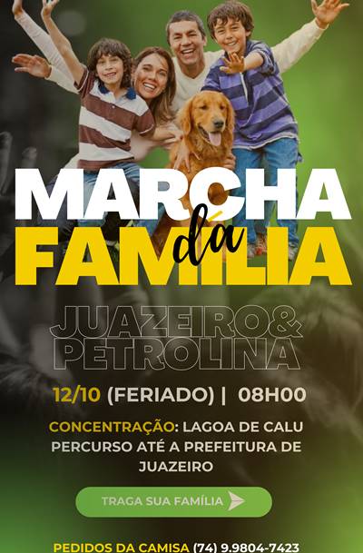 A comunidade evangélica e católica de Juazeiro (BA) está contando as horas para mais uma Marcha da Família, que acontecerá nesta quinta-feira (12), a partir das 8h. Pacífica e ordeira, a mobilização vai se concentrar na Lagoa do Calu, saindo em seguida em direção à Avenida Adolfo Viana. O encerramento será no Paço Municipal (Orla I).