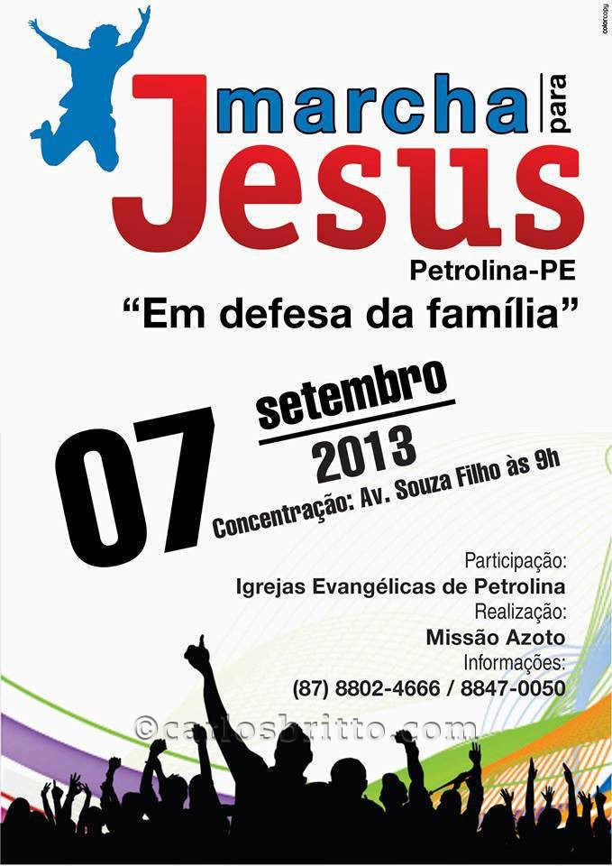 MARCHA PARA JESUSPastores evangélicos de Petrolina realizarão neste sábado (7), a partir das 9h, uma Marcha para Jesus. A concentração será na Avenida Souza Filho, Centro da cidade.