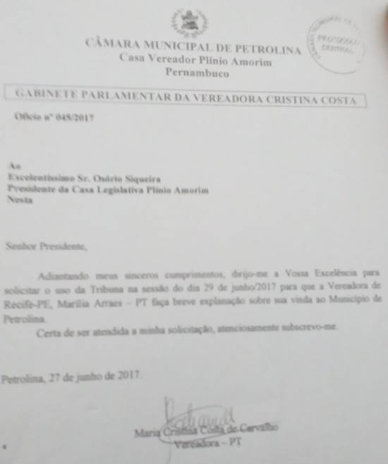 À imprensa, a vereadora mostrou um ofício solicitando à presidência da Mesa Diretora um espaço na tribuna durante a sessão plenária do dia 27 – que foi também a última do primeiro semestre – para falar da vinda de Marília a Petrolina.