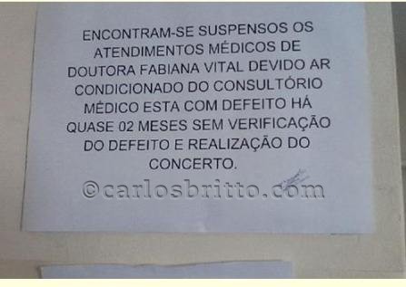 Seguindo o calendário de saúde, fui vacinar minha bebê de 1 ano e 3 meses. Enquanto aguardava a minha vez, fui ler os avisos que estavam nas paredes e fiquei indignada com este aviso aqui. Quer dizer que ela (a médica) suspendeu o atendimento apenas pelo fato do ar da sala estar quebrado. Aí me pergunto: Será que ela também suspendeu o salário por não estar cumprindo sua função? Cadê a Secretaria de Saúde?