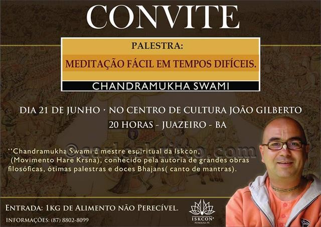 Será realizada logo mais, às 20h, no Centro de Cultura João Gilberto, em Juazeiro, uma palestra com o líder espiritual da Iskcon, Chandramukha Swami. A palestra terá como tema ‘Meditação fácil em tempos difíceis’ e a entrada é apenas um quilo de alimento não perecível.