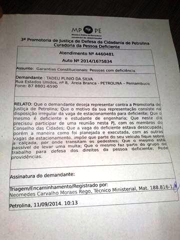 Integrante do Conselho das Cidades em Petrolina e servidor público do município, Tadeu Plinio da Silva foi convocado pelo Ministério Público de Pernambuco (MPPE) para uma reunião no órgão. Mas o que ele não esperava era ter de procurar uma vaga para estacionamento de veículos, destinadas a pessoas com deficiência, e não encontrar. Ou seja. o próprio MPPE descumpre a lei. O servidor público não perdeu tempo: foi à secretaria do Ministério Público e entrou com uma representação contra o órgão.