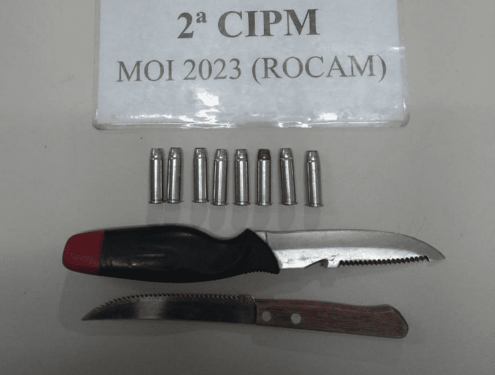 Ainda de acordo com a 2ª CIPM, o menor se desfez de um invólucro, ao avistar o policiamento. Após fazer uma revista no local, foi encontrado o material: 8 munições (calibre 38, intactas) e 2 facas.