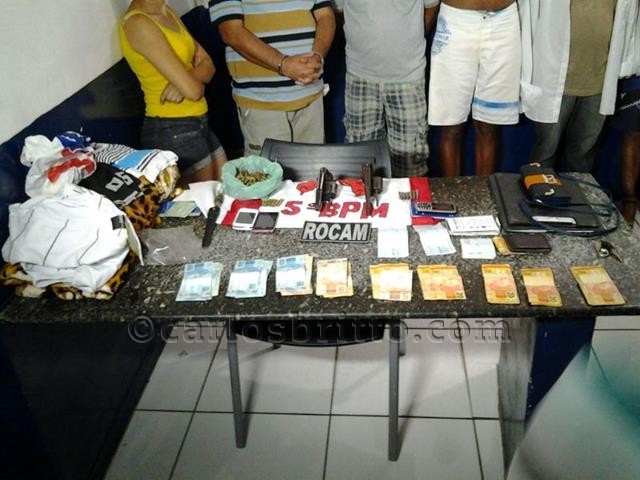 Com os elementos foram apreendidos R$ 11.355,50 (R$ 5.052,00 em espécie e R$ 6.303,50 em cheques), dois revólveres calibre 38 e munições, além de aparelhos celulares, aproximadamente 50 gramas de maconha pronta para consumo e algumas roupas frutos de outros roubos. A quadrilha é suspeita de diversos outros assaltos na região. Todos os envolvidos e o material apreendido foram encaminhados à Delegacia de Polícia Civil (DPC). (Foto: 5° BPM/divulgação)