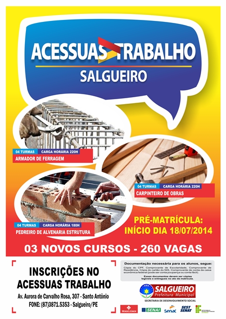 O município de Salgueiro (PE), no Sertão Central, está com 260 vagas para os cursos de armador de ferragem, carpinteiro de obras e pedreiro de alvenaria. Os interessados devem adiantar suas inscrições, já que as mesmas serão encerradas após o preenchimento das vagas.