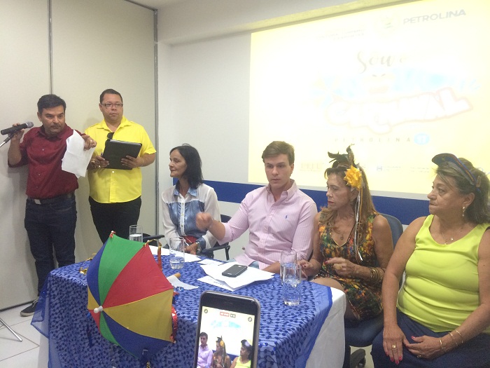 Com o tema ‘Sou o Novo Carnaval’, o prefeito de Petrolina, Miguel Coelho (PSB) lançou nesta quarta-feira (15), em coletiva de imprensa realizada no auditório do Sebrae, Centro de Convenções Nilo Coelho, a programação oficial da folia na maior cidade do Sertão. Miguel estava acompanhado da vice-prefeita Luska Portela, secretária municipal de Cultura, Turismo e Esporte, Maria Elena Alencar e da homenageada do evento este ano: a carnavalesca, agitadora cultural e professora Déa Rachel, que durante 30 anos, como servidora pública municipal, coordenou e participou da organização de muitos carnavais em Petrolina e até hoje não deixa de brincar a folia na cidade.