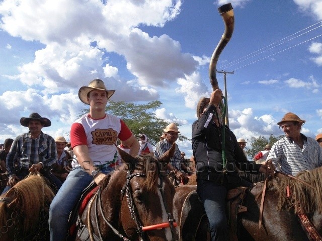 Além da abertura, Miguel compareceu à Missa do Vaqueiro, ao lado do prefeito Roniere Reis (com o berrante). O pré-candidato aproveitou para destacar a importância econômica e cultural da Caprishow.