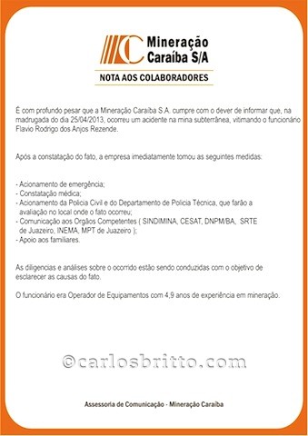 A Mineração Caraíba enviou nota a este Blog com informações preliminares sobre acidente de trabalho com equipamento ocorrido na madrugada do último dia (25) na mina subterrânea e que causou a morte do operador de equipamentos e funcionário da empresa, Flávio Rodrigo dos Anjos Rezende, 28 anos, natural de Petrolina.