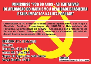 Intitulado “PCB 90 anos – As tentativas de aplicação do Marxismo à realidade brasileira e seus impactos na luta popular”, o minicurso será ministrado pelo sociólogo e cientista político, Professor Fausto Arruda Aguiar Filho.