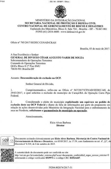 Esclarecemos que, por equívoco, o Ministério da Integração pediu a exclusão do Município de Curaçá da Operação Carro-pipa Federal, situação que, logo constatada, foi imediatamente corrigida, conforme segue na comunicação anexa (veja aqui).