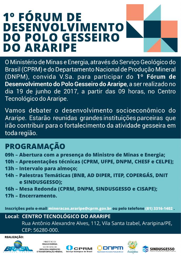 O município de Araripina (PE) sediará, na próxima segunda-feira (19), o 1º Fórum de Desenvolvimento do Polo Gesseiro do Araripe. O evento é promovido pelo Ministério de Minas e Energia, através da Companhia de Pesquisa de Recursos Minerais (CPRM) e do Departamento Nacional de Produção Mineral (DNPM), com o apoio da Prefeitura de Araripina e do Sindicato da Indústria de Gesso de Pernambuco (Sindusgesso). No fórum, que acontecerá no Centro Tecnológico do Araripe, a partir das 9h, já está confirmada a presença do ministro Fernando Filho.