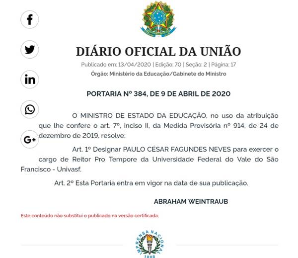 O ministro da Educação, Abraham Weintraub, nomeou o Professor Paulo César Fagundes Neves como reitor pro tempore da Universidade Federal do Vale do São Francisco (Univasf). A Portaria nº 384, de 9 de abril, foi publicada na edição desta segunda-feira (13) do Diário Oficial da União (DOU). Fagundes Neves é médico ortopedista e atua em Petrolina. Ele foi indicado ao cargo pelo deputado federal Pastor Eurico.