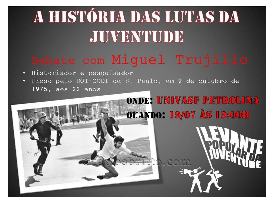 No sábado (20), Trujillo participa do Curso de Formação do movimento Levante Popular da Juventude, abordando com mais detalhes o tema. A programação, neste dia, será iniciada às 9h no Centro Paroquial do bairro João de Deus. Quem deseja outros detalhes sobre o evento pode entrar em contato através do número (87) 9961-3153.