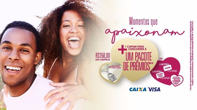 De hoje até o próximo dia 12/06, quem efetuar compras a partir de R$ 150,00 com os cartões de crédito e/ou débito Caixa, terá direito a três cupons da campanha de namorados “Momentos que Apaixonam”. Já quem utilizar os de crédito e/ou débito Caixa Visa terá direito a quatro cupons e ao atendimento preferencial em um dos caixas do balcão de trocas.