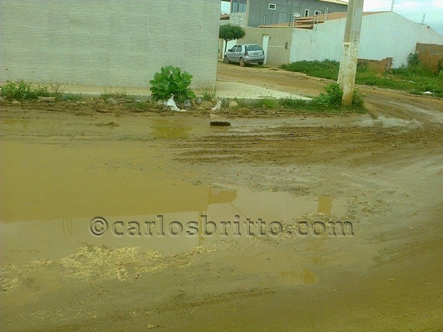 Toda vez que dá uma chuva mais forte, meu esposo tenta abrir valetas nas laterais pra ver se a água escorre, mas sem sucesso. Inclusive ele estava fazendo mais uma valeta, quando passava na rua um funcionário da prefeitura, que parou o carro e disse ao meu esposo que ele não precisava fazer aquele trabalho, pois o mesmo iria enviar uma máquina para fazer o serviço de escoamento da água. Estamos esperando até agora e essa máquina não chegou, como sempre mais uma promessa.