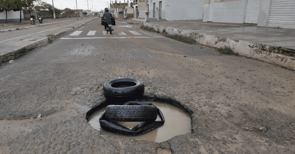 Na Avenida dos Tropeiros, zona oeste de Petrolina, os moradores da área improvisam um alerta as condutores de veículos quanto a um imenso buraco num trecho da pista. Eles utilizaram alguns pneus no local, sinalizando para o problema.