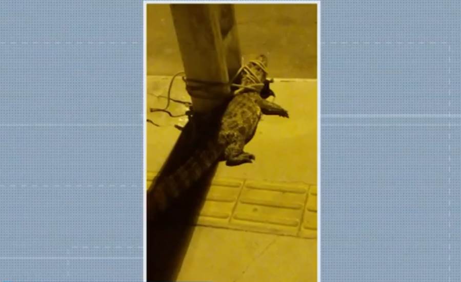 Moradores de residencial em Juazeiro capturam jacaré e amarram animal em poste