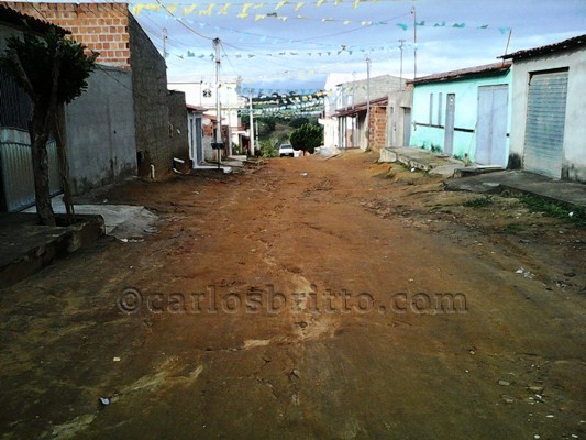 Muitas ruas da cidade de Senhor do Bonfim, no norte da Bahia, ainda não possuem calçamento nem rede de esgoto, e quando chove na região viram verdadeiros lamaçais. O relato é da moradora Rita Felipe, residente no bairro Vila Nova.
