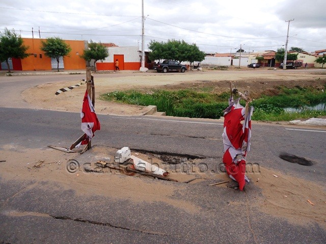 O Blog já mostrou o problema no último dia 26 de fevereiro, mas até agora nada foi feito e o risco de acidentes no local é iminente. O buraco surgiu depois que as placas de concreto da via cederam. Uma dessas vias está interditada, prejudicando o acesso ao bairro Antônio Cassimiro, na zona norte da cidade.