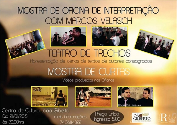 mostra de oficina de interpretaçãoO Centro de Cultura João Gilberto, em Juazeiro, será palco na próxima quarta-feira (21), às 20h, de uma Mostra de Oficina de Interpretação para teatro, cinema e TV. Sob a coordenação do ator e diretor Marcos Velasch, a Mostra é o resultado da capacitação realizada entre os meses de outubro, novembro e dezembro de 2014.