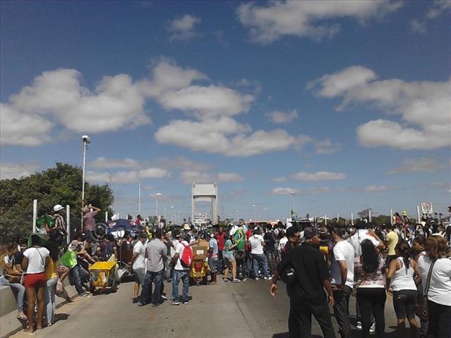 Enquanto permanecem na Ponte, os manifestantes aproveitam para pedir a liberação da Ilha do Fogo. Daqui a pouco, o movimento segue para as ruas de Juazeiro, onde o protesto será concentrado em frente à sede do executivo municipal. No novo protesto desta quinta-feira (27), os manifestantes continuam pedindo, entre outras coisas, mais educação, saúde e menos corrupção. (Foto:Miro Souza)