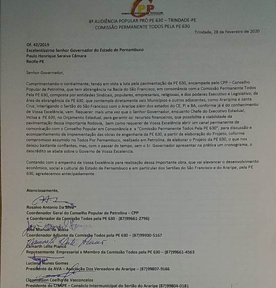 Mais um ofício solicitando a inclusão das obras de pavimentação asfáltica da PE-630 no Orçamento Estadual será enviado ao governador Paulo Câmara. Esse foi o resultado da 8ª audiência popular que debateu o tema. O encontro, promovido pelo Conselho Popular de Petrolina (CPP) em parceria com a comissão permanente do Movimento ‘Todos Pela PE-630’, foi realizado na última sexta-feira (28/02) na Câmara de Vereadores de Trindade, Sertão do Araripe.