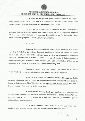 O Ministério Público Federal (MPF) em Petrolina decidiu instaurar inquérito para apurar os motivos que impedem a Secretaria Municipal de Saúde de dar informações sobre os recursos do Ministério da Saúde ao Cerest, o Centro de Referência dos trabalhadores no setor.