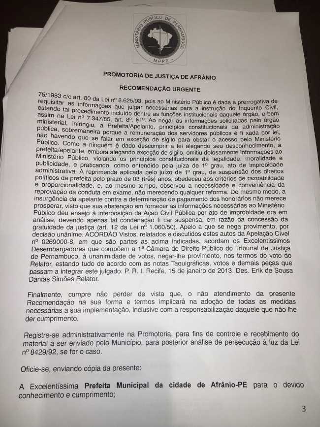O Ministério Público de Pernambuco (MPPE) está recomendando à prefeita de Afrânio, Lúcia Mariano (PTB), que regularize tanto o serviço de Tratamento Fora do Domicílio (TFD) quanto o Conselho Tutelar naquela cidade do Sertão do São Francisco.