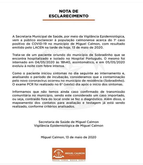 O município de Miguel Calmon, norte da Bahia, confirmou o primeiro caso positivo do novo coronavírus (Covid-19). O resultado foi emitido ontem (13) pelo Laboratório Central (Lacen) de Salvador e divulgado pela Secretaria de Saúde da Prefeitura de Miguel Calmon.