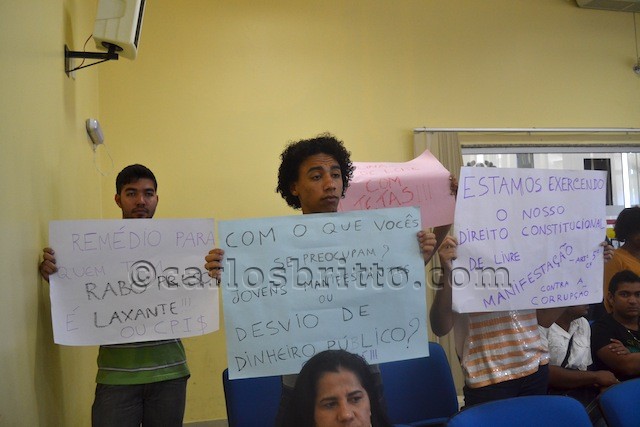 Empunhando faixas, mas de forma pacífica, eles ressaltaram o direito constitucional de se manifestarem e cobraram dos legisladores da Casa Plínio Amorim uma postura mais rígida no combate à corrupção.