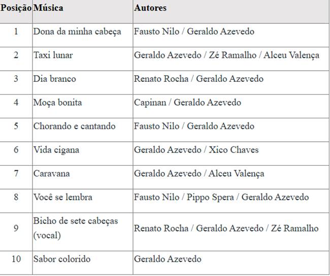 O levantamento apontou as canções do petrolinense mais tocadas no país, as mais gravadas e os intérpretes que mais gravaram as músicas de sua autoria. Elba Ramalho figurou na liderança desse levantamento, seguida por Alceu Valença e Zé Ramalho, em segundo e terceiro lugares respectivamente. Os três, inclusive, fazem parte da carreira de Geraldo e foram seus parceiros no projeto O Grande Encontro, que teve sua estreia na década de 90.