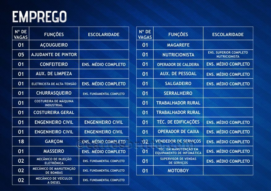 Entre as oportunidades de trabalho para a região, destaque para a quantidade de vagas para garçom – 18 ao todo. Ainda há chances para quem tem ensino superior, como engenheiro civil e nutricionista.