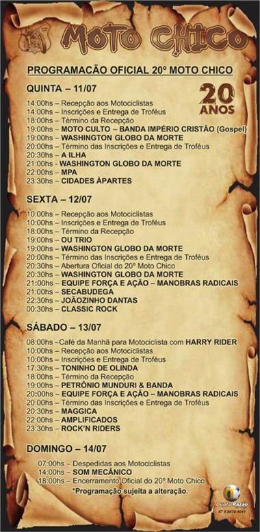 O evento, que já faz parte do calendário turístico de Petrolina, acontecerá entre os dias 11 e 14 de julho, no estacionamento do Parque Josepha Coelho, área central. As novidades deste ano ficarão por conta do Washington Globo da Morte, um moto culto com a Banda de Gospel Império Cristão e a Equipe Força e Ação (de manobras radicais). A programação completa pode ser conferida abaixo.