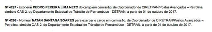 A 8ª Ciretran/Detran-PE em Petrolina já tem seu novo coordenador. Trata-se de Natan Santana Soares. A substituição de Natan por Pedro Neto já foi divulgada no Diário Oficial do Estado (DOE).