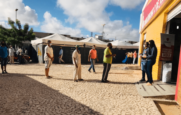 Nesta segunda-feira (15) Juazeiro (BA) iniciou sua segunda fase de reabertura gradual das atividades comerciais, dos mercados, feiras e Camelódromo 2 de Julho. Pela manhã foram distribuídas máscaras de proteção por voluntários do grupo ‘Respira Vida’, junto com a equipe da Agência Municipal de Abastecimento (AMA), aos permissionários desses espaços, além das pessoas que passavam, como forma de proteção contra o novo coronavírus (Covid-19).